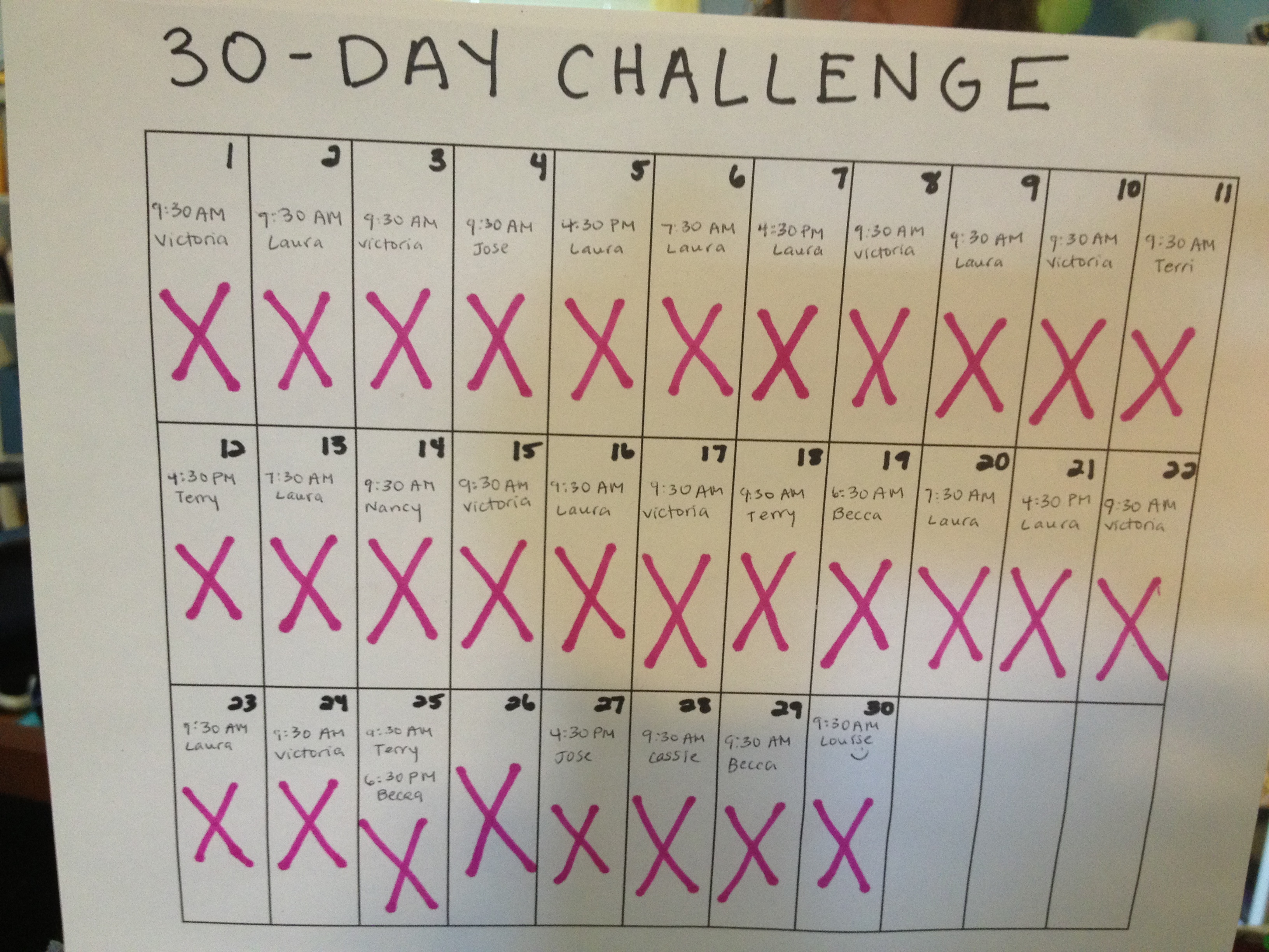 I was heartbroken. There was no way I could extend my challenge, not after all the hard work I’d put in already. But the people in the other studio didn’t even know me! They hadn’t seen me dodge a hornet or fall out of triangle pose and hit the side wall. They wouldn’t know that my knees are inflexible from years of mogul skiing or that sometimes my neck hurts when I come up in back bends. The instructors in my home studio- my instructors, as I’ve started to referring to them in my head- have seen my journey. Sometimes they’ve even quoted my blog during class (which jumped right over “hot shower on a cold day” to take the #1 spot on my list of best feelings ever). Having to finish my challenge at a different studio felt like a terrible, lonely fate. Not to mention it completely threw off my plans for Day 30 celebrations.